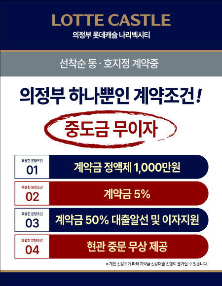 동의합니다. [내용보기] 정보통신망 이용촉진 및 정보보호에 관한 법률을 준수하고 있습니다. 수집하는 개인정보 항목 서비스 이용을 위해 필요한 최소한의 범위로 개인정보를 수집합니다. 수집 및 이용목적 관심 단지에 대한 분양 홍보 및 상담, 고객행사 보유 및 이용기간 이용목적이 달성된 후에는 예외없이 해당 정보를 지체없이 파기합니다. 등록